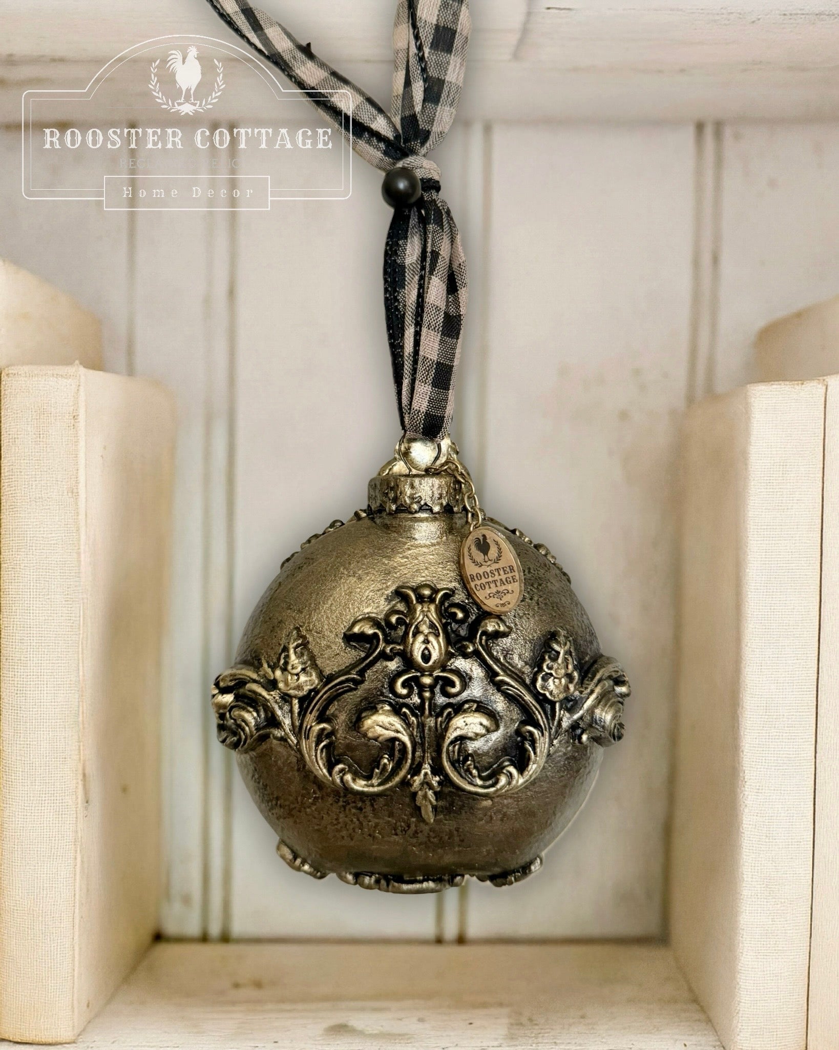 Moonlight Witch Ornament: Handcrafted 2D ornament featuring a witch and black cat cast from ceramic resin against a dark forest background. Finished with high-gloss resin for a spellbinding effect. Elegant detailed mouldings painted black and highlighted with bronze metallic gilding. Includes black and ivory ribbon for hanging.