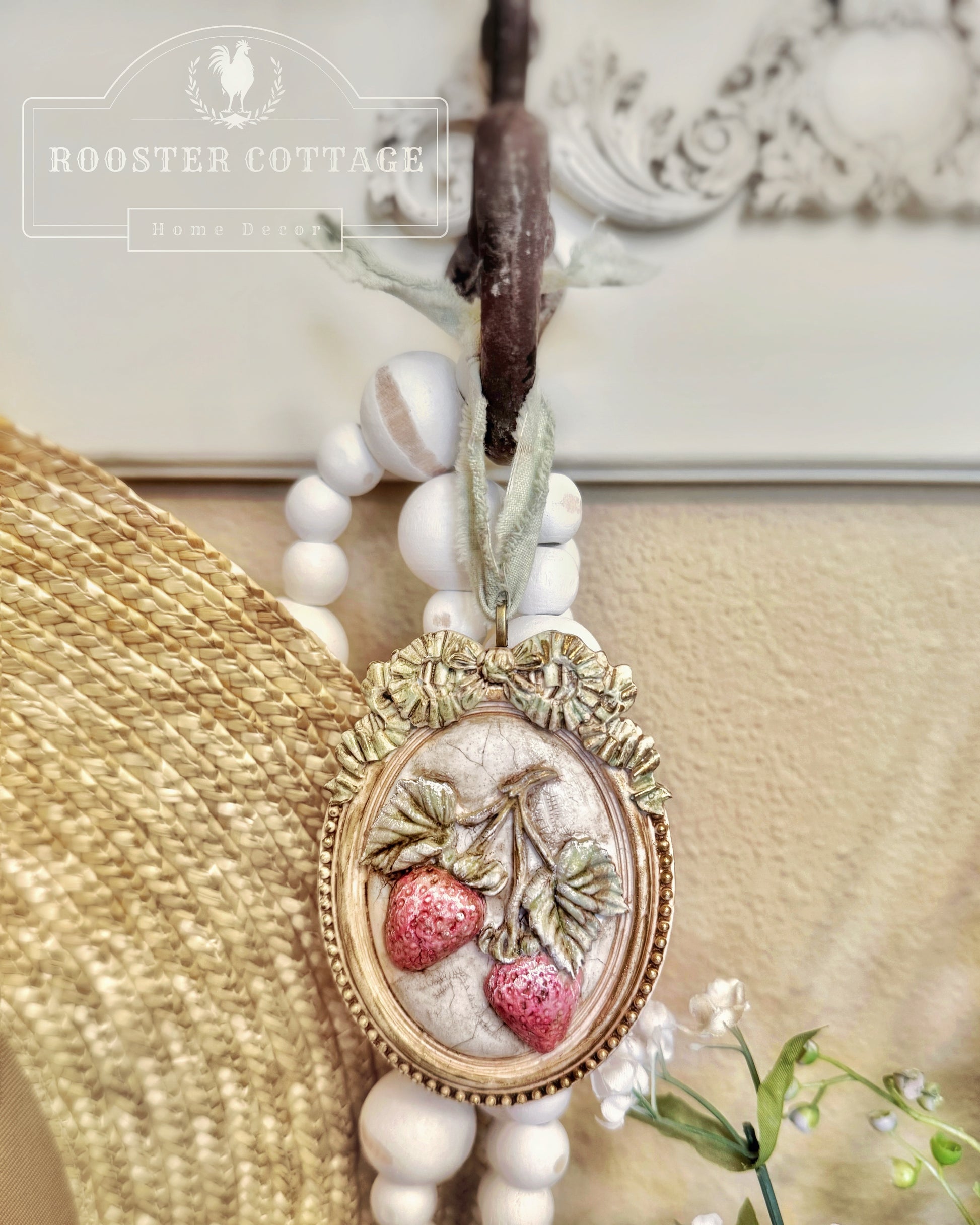 Bring a touch of the countryside into your home with this beautiful Framed Strawberry Specimen ornament. Handcrafted with precision and care, this piece features an intricate strawberry casting, painted in soft hues and aged to perfection. The ivory frame, adorned with subtle gold accents and a charming green bow, gives this piece a delightful French charm. Finished off with a green ribbon, this ornament is perfect for hanging from a cabinet or drawer pull.
