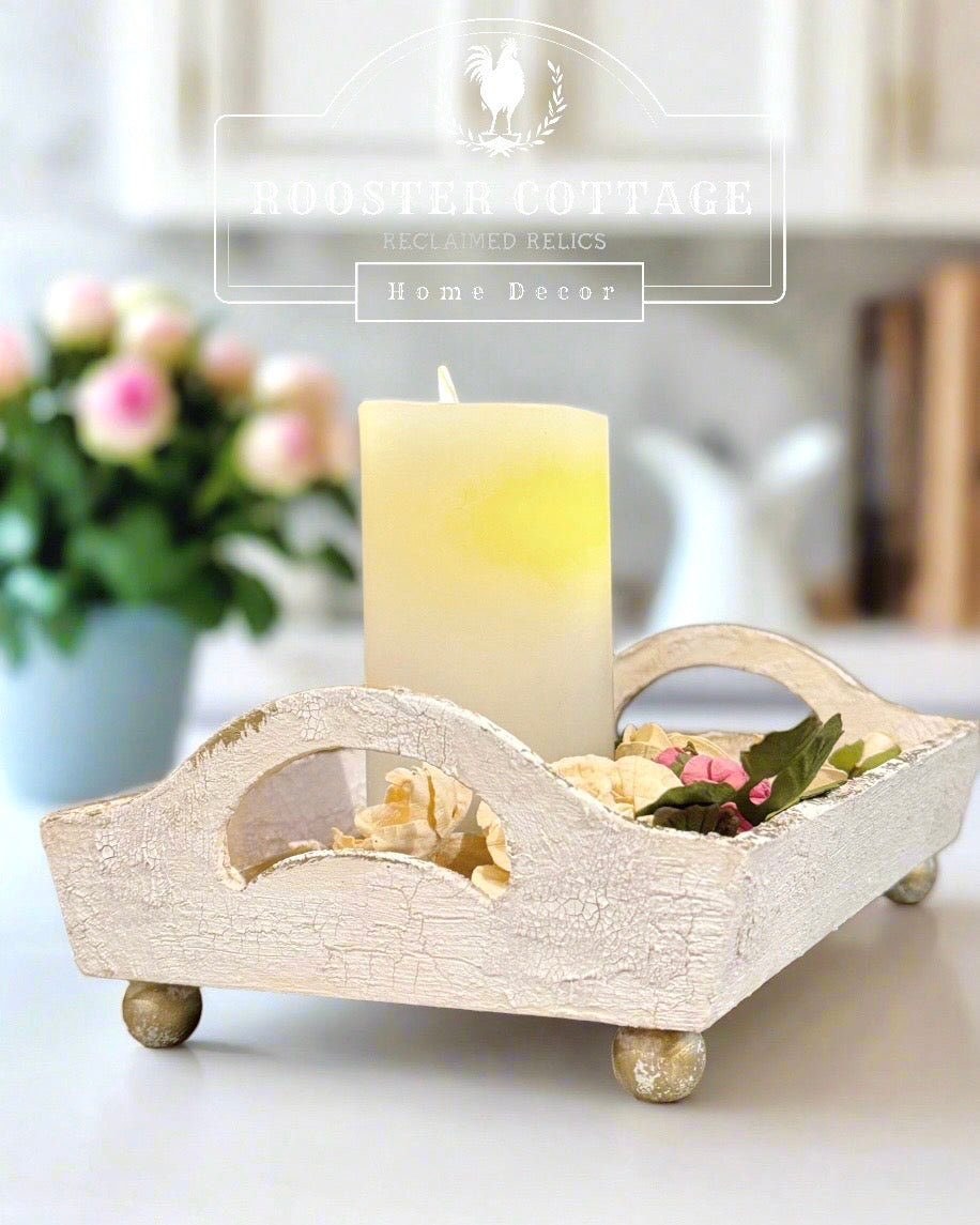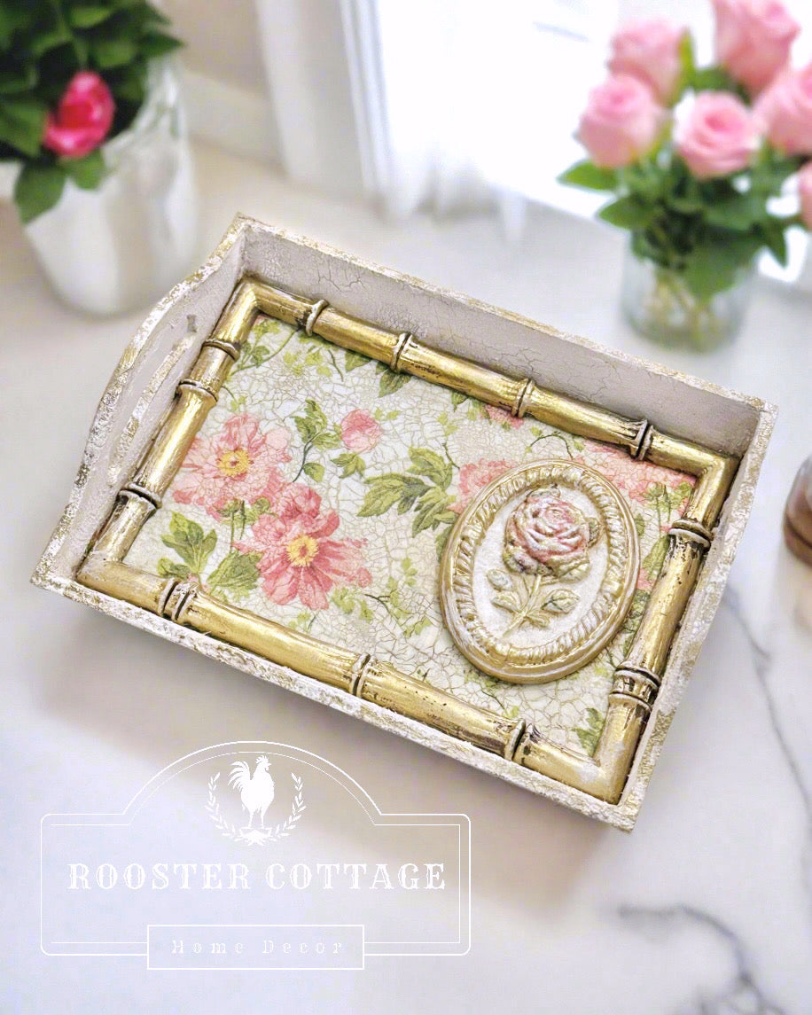 This beautifully distressed, handcrafted wooden floral tray boasts a richly layered, antiqued finish that tells a story of its own. Delicate bamboo moulds elegantly surround the intricate floral pattern, accentuated by subtle gold highlights. With its vintage charm and delicate design, it's perfect for showcasing a candle, jewelry, or treasured keepsakes, adding a touch of country charm to any room.